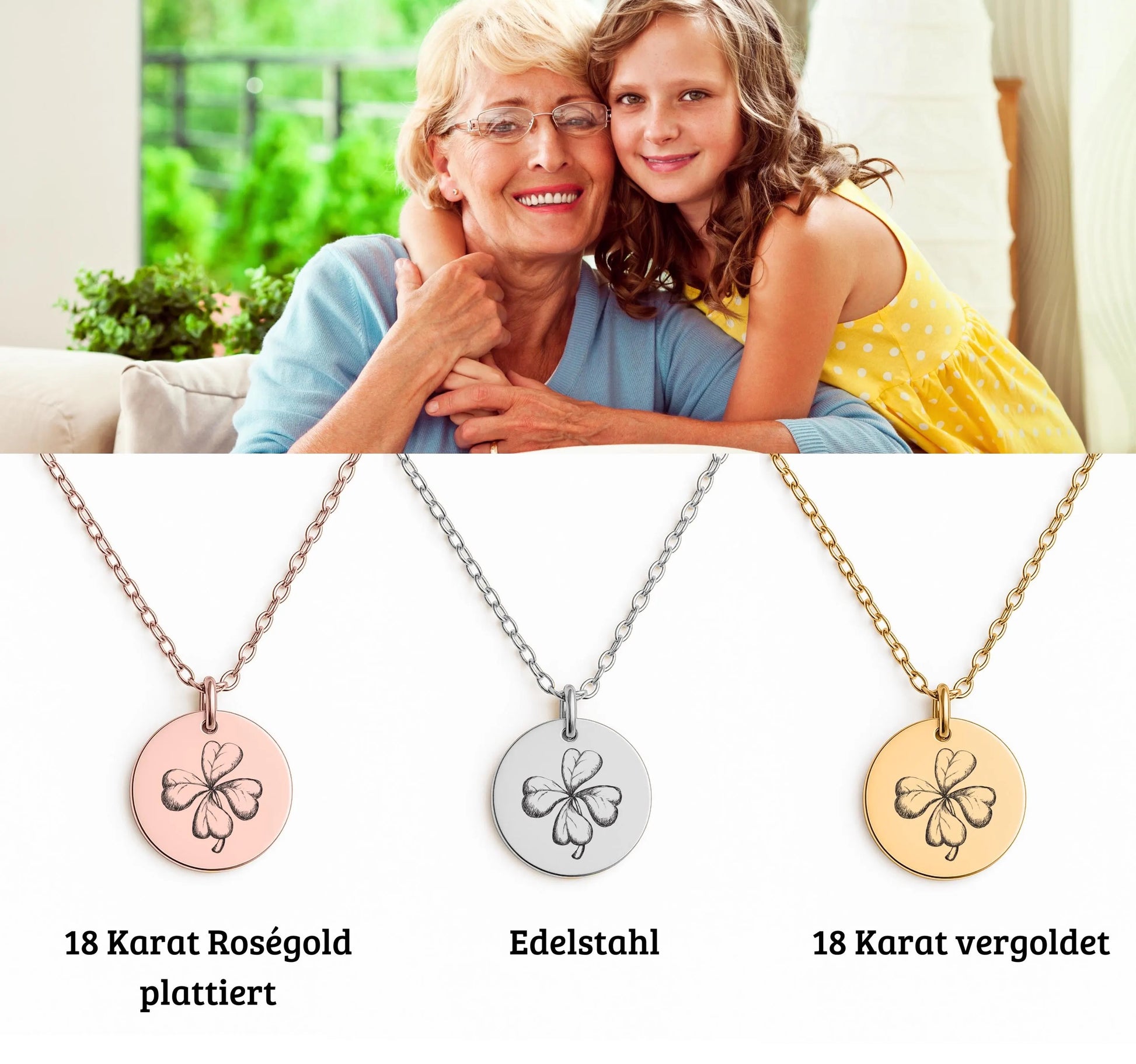 Diese personalisierte Kleeblatt-Halskette aus 18K vergoldetem Edelstahl ist ein besonderes Geschenk von Oma an Enkelin. Mit einem fein gravierten vierblättrigen Klee symbolisiert sie Stärke, Mut und unbedingte Liebe.