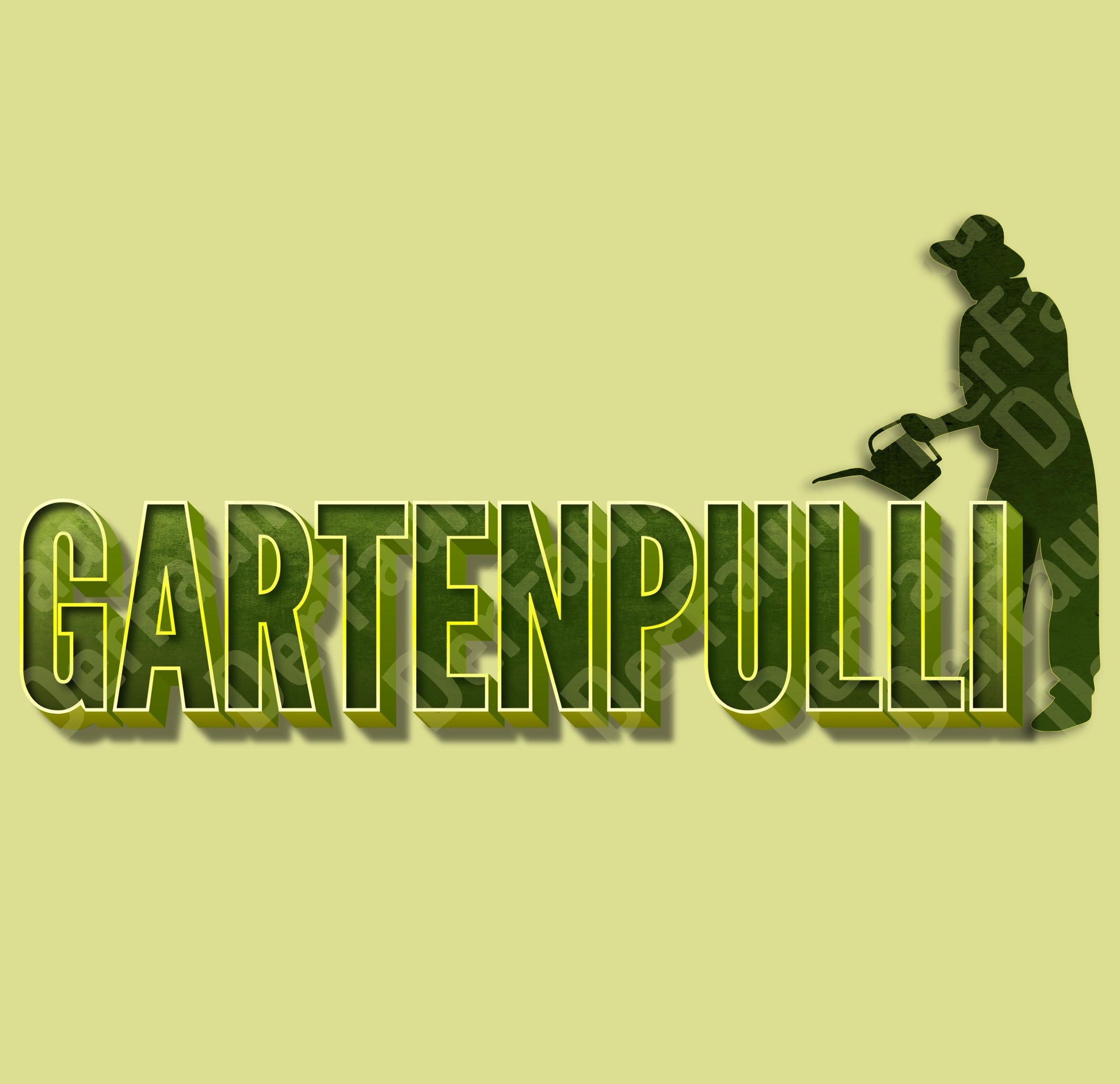 Die schöne Illustration zeigt den Schriftzug Gartenpulli in 3D Optik, verziert mit Gärtner.